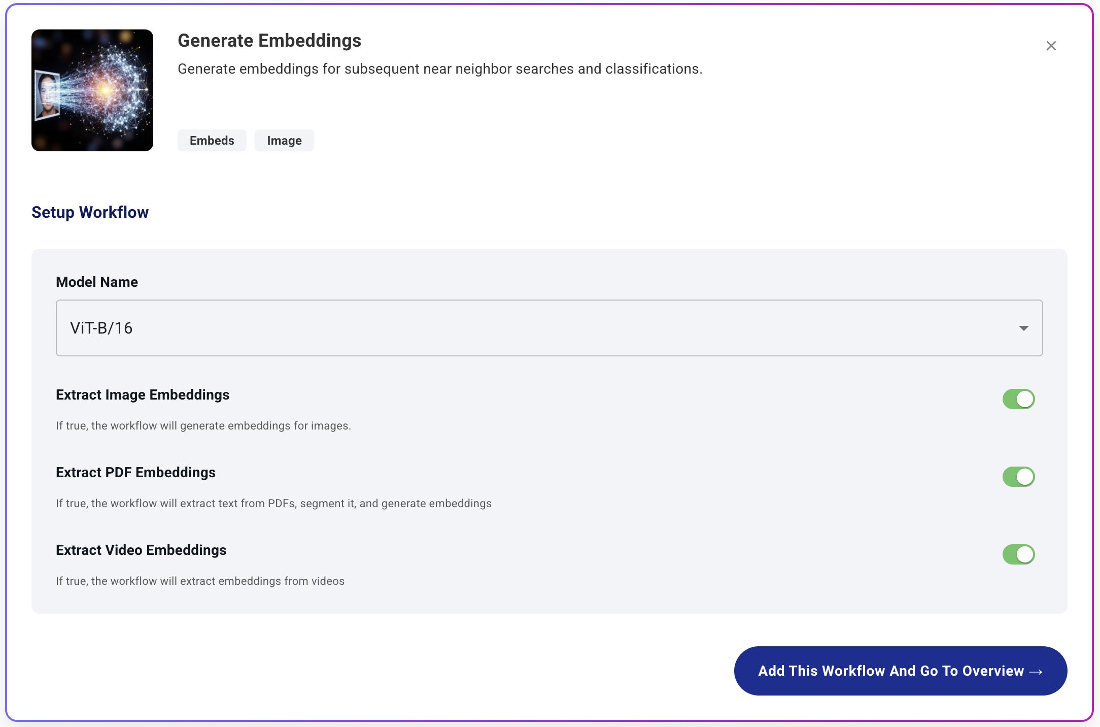 This workflow allows you to add embeddings for images in ApertureDB using a pre-trained model. This means that you can use the embeddings to search for similar images, or to classify images based on the embeddings. This provides an easy way to add embeddings to your images, and to see how they can be used with real data.